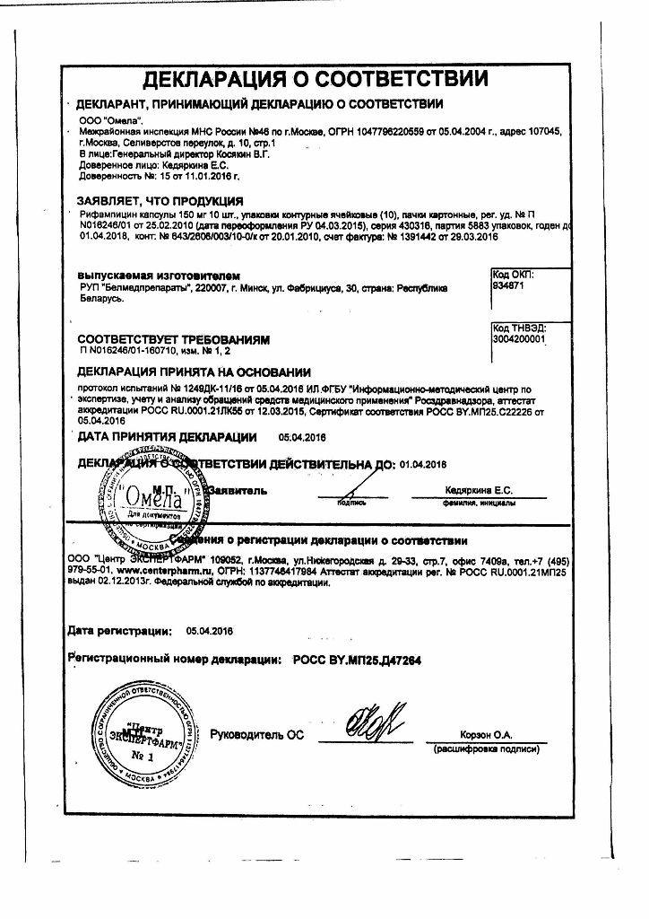 Рифампицин хорошо всасывается из желудочно-кишечного тракта и быстро проникает в ткани и жидкости организма, в том числе в каверны, кости, плевральный экссудат, мокроты. Максимальная концентрация препарата в крови отмечается через 2:00 после приема внутрь. На терапевтическом уровне концентрация поддерживается в течение 8-12 часов (для высокочувствительных возбудителей - в течение 24 часов). Метаболизируется в печени. Период полувыведения 2-5 часов. Выводится из организма главным образом с желчью, незначительная часть - с мочой.