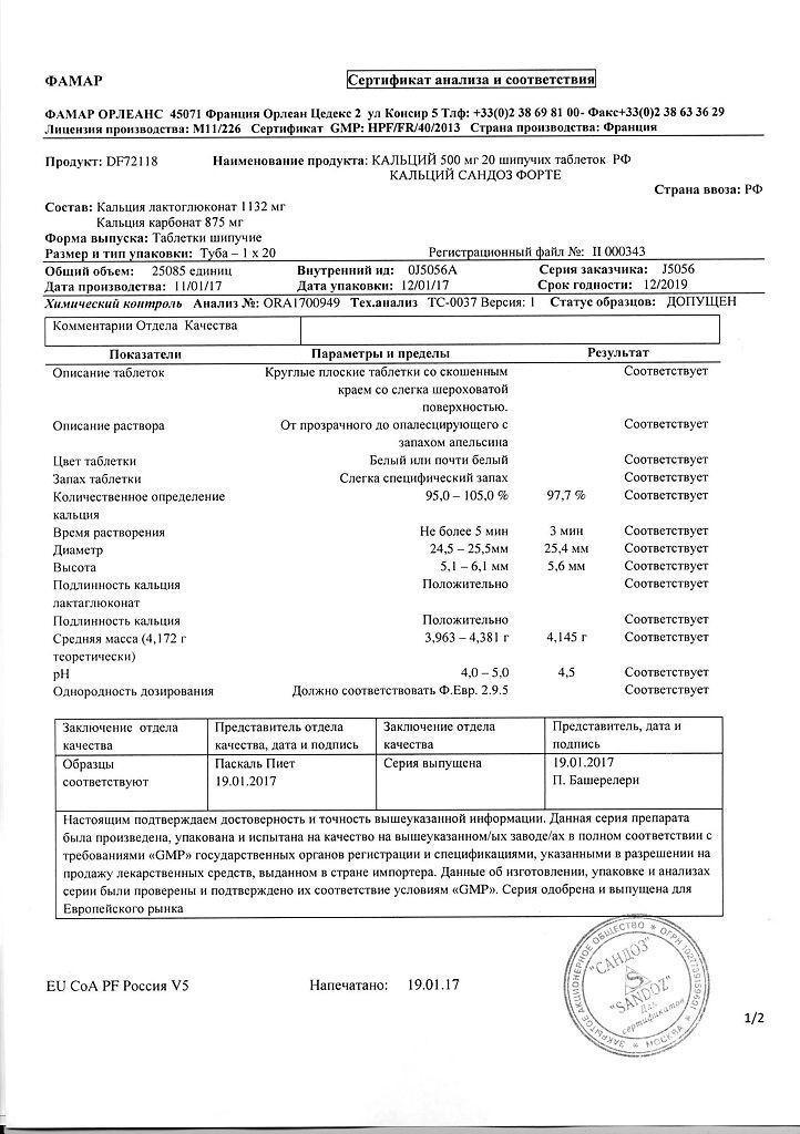 Кальций Сандоз Форте - это препарат кальция. Его ионы необходимы для передачи нервного импульса, формирования костной ткани, сокращения мышц (в том числе и сердечной мышцы), свертывания крови, адекватного функционирования других органов и систем организма.