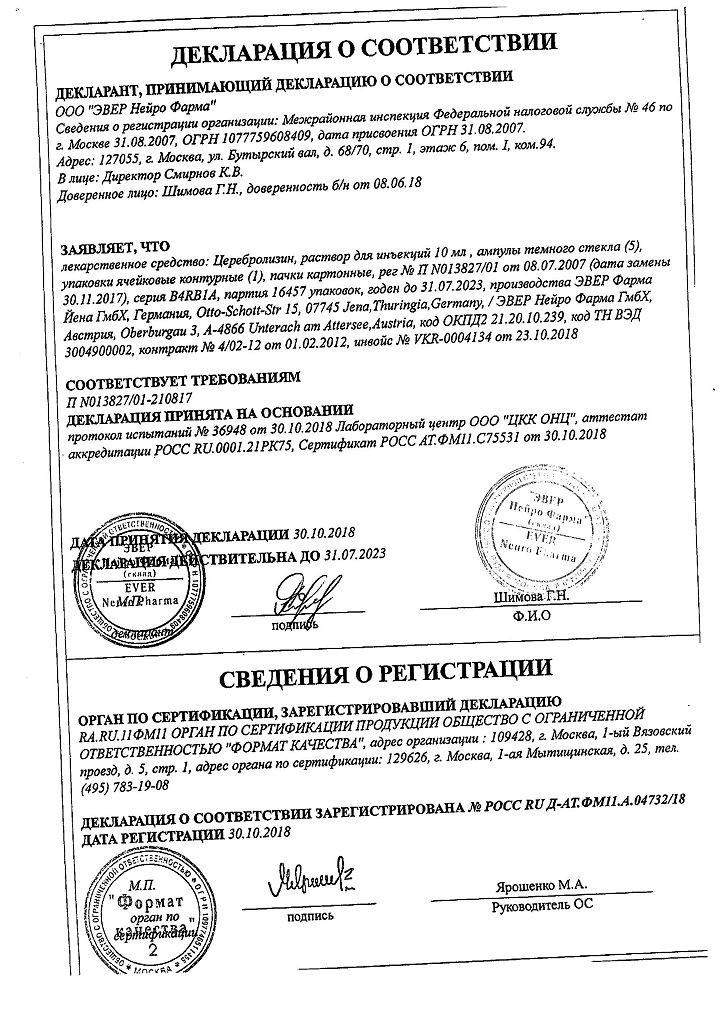 1 мл раствора содержит: 215,2 мг концентрата Церебролизина (пептидного препарата, что производится с мозга свиней).