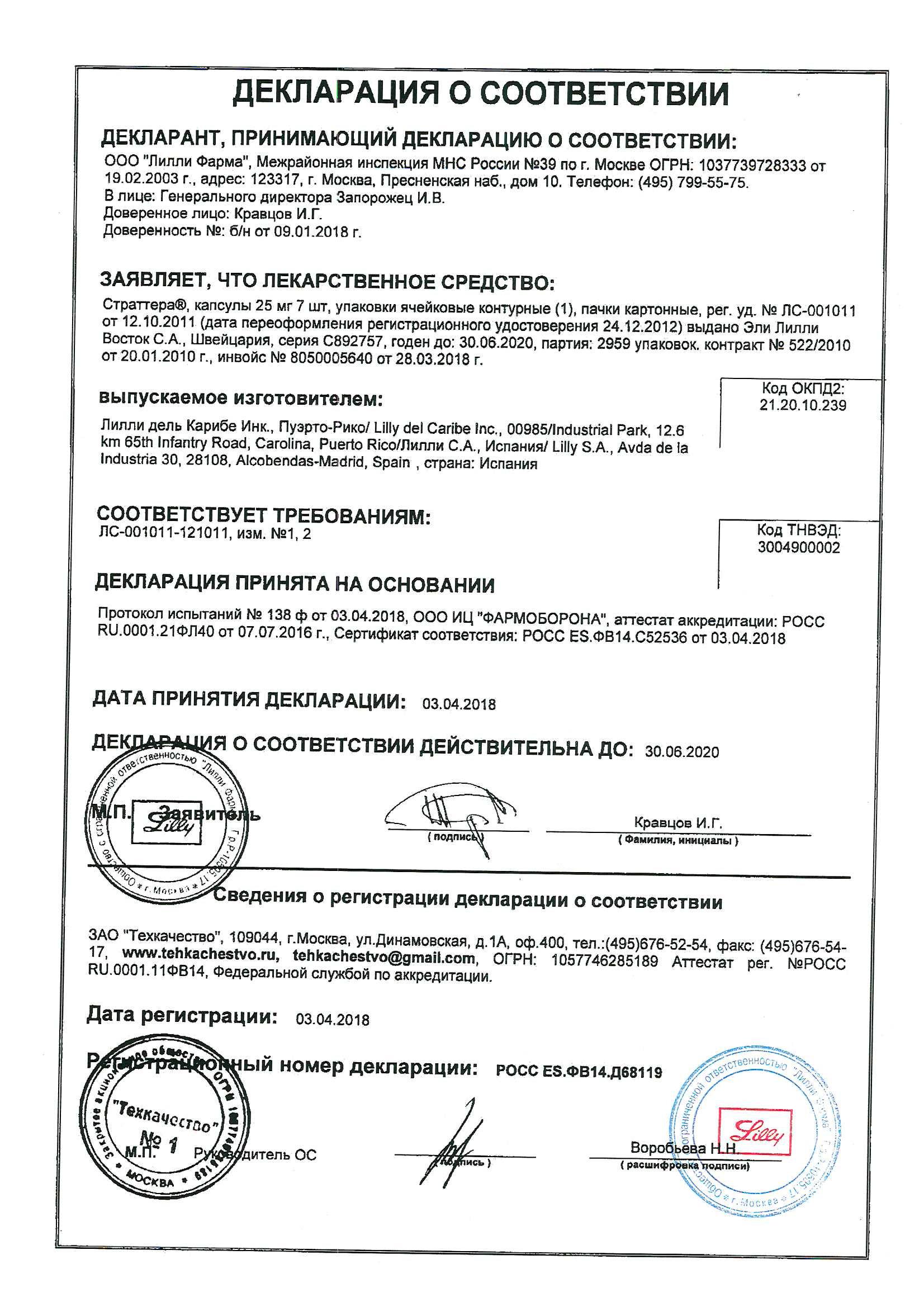 В 1 капсуле Страттеры заключено 10, 18, 25, 40 либо 60 мг атомоксетина гидрохлорида в зависимости от заявленной дозировки.