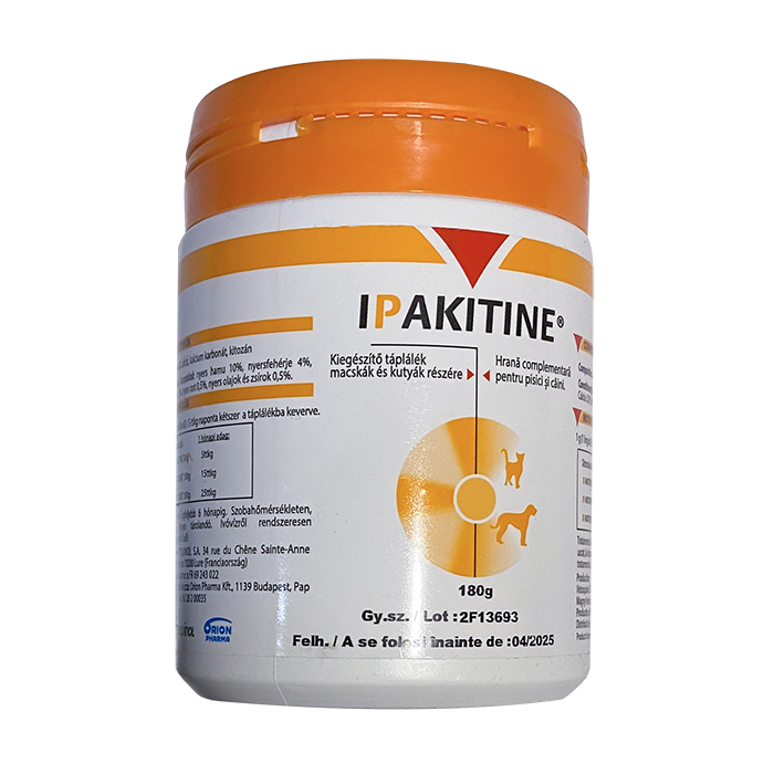 Применение. Дают животному 2 раза в сутки в утреннее и вечернее кормление, смешивая отмеренное количество порошка с влажным. Доза на один прием составляет 1 мерная ложка (1 г порошка) на 5 кг массы тела. Если животное получает только сухой корм, рекомендуется замочить часть корма в теплой воде до разбухания, смешать с порошком Ипакитин и добавить к основной массе корма. Продолжительность разового курса составляет 3-6 месяцев, в зависимости от индивидуальных особенностей организма и характера течения заболевания. Во время приема Ipakitine животные должны получать достаточное количество воды.